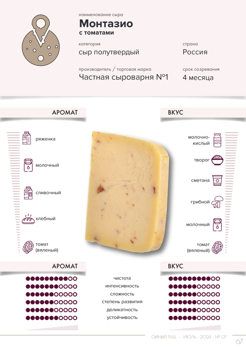 Все чаще на прилавках можно встретить не просто сыры, а сыры с добавками. Специи, чеснок, грибы, зелень и многое другое. Добавки придают подобным сырам еще большее разнообразие вкуса и аромата. Сыры с добавками хороши как самостоятельный продукт, так и в качестве дополнения к различным блюдам: брускетты, салаты и горячие блюда. Попробуйте разнообразить свой сырный рацион с помощью сыров с добавками. Ароматика и вкус сыра с яркой кислинкой, во вкусе выражен грибной нюанс (жюльен – опята). Добавка в виде томатов дополняет органолептический профиль сыра. Послевкусие сыра непродолжительное. Вариант употребления - в составе горячих блюд, брускетт. Сыр с тмином, который хорошо интегрирован в аромат и вкус сыра. Сыру не достает удаленной корочки. Во вкусе сыр с яркой кислотностью, вкусу не хватает жирности и соли. Вариант использования – в горячих блюдах, десертах для расширения органолептического профиля блюд. Необычный для своей категории сыр, исходя из его ароматики и вкуса. Можно употреб