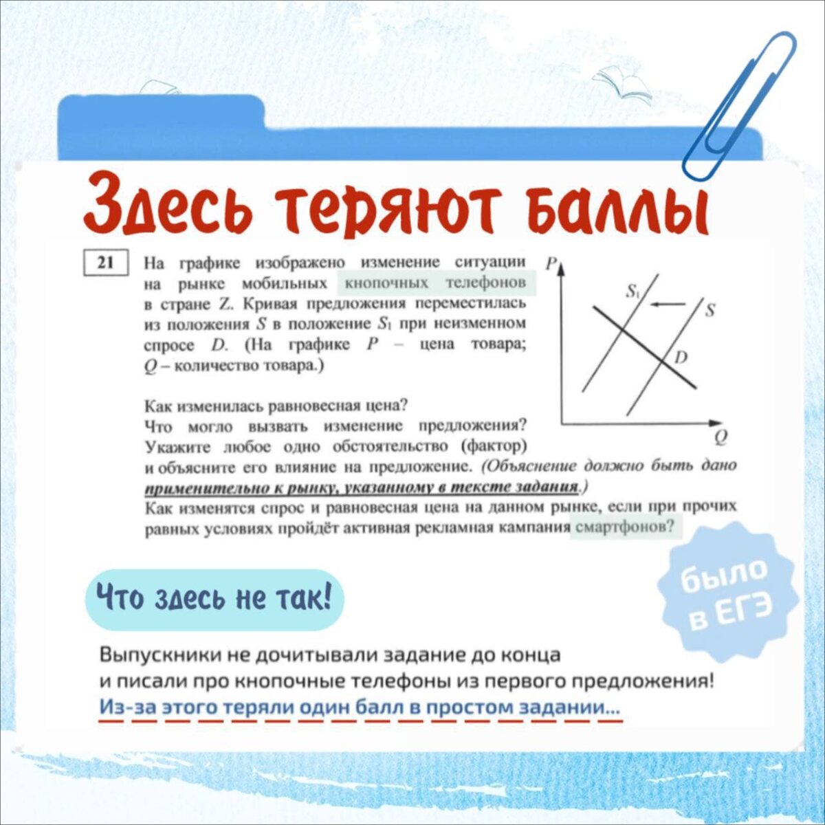 Если хочется что-то спрятать - положите на видное место ИЛИ как легко потерять баллы там, где вы можете получить максимум! Пару лет назад из-за этой ловушки составителей 44% выпускников потеряли заветные баллы в задании 21 по обществознанию 👆 Вроде бы пустяковое задание из блока «Экономика», которое многие при подготовке щелкают, как орешки. А помешала банальная невнимательность😞 ⚡️⚡️⚡️⚡️Всегда дочитывайте задания ДО КОНЦА!