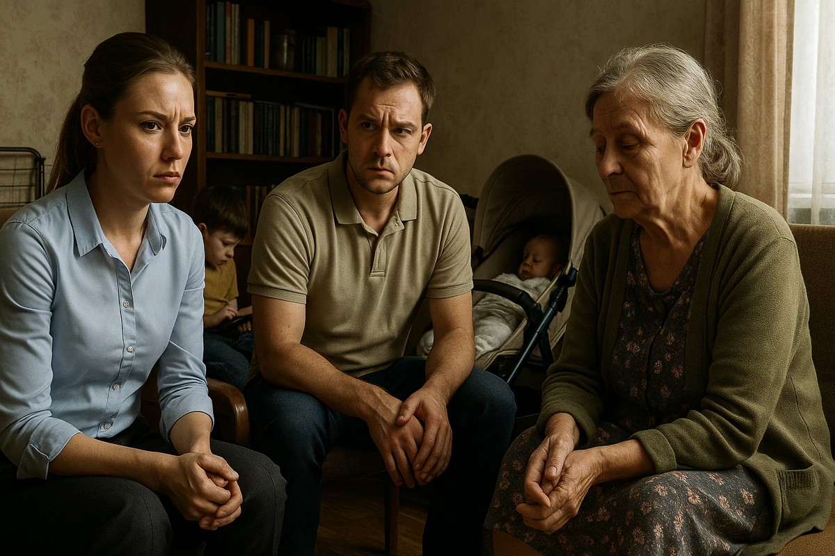 Людмила Петровна встретила их красными от слёз глазами. Катюша мирно спала в коляске, Денис сидел в углу с планшетом. Обычная воскресная картина, если бы не это напряжение, висевшее в воздухе.