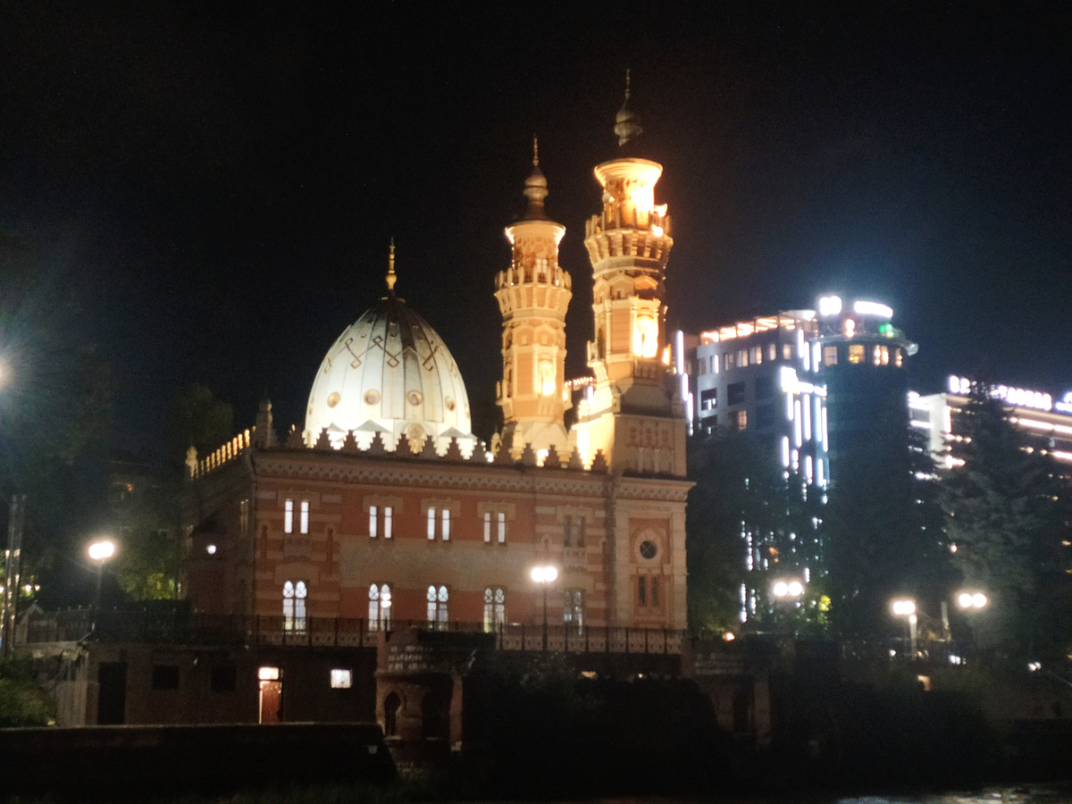 Уже было темно, когда мы пошли осматривать город. Владикавказ красиво освещён. Мы прошли по главному пешеходному бульвару - проспекту Мира, на нем стоят чудесные небольшие здания 19 века. Потом мы вышли к берегу Терека. Могучая река здесь быстро несёт свои воды в каменных берегах набережной. Вышли к главному парку Косты Хетагурова. Это очень красивое место. На другой стороне там находится мечеть Мухтарова, построенная в начале 20го века. Она хорошо освещена и замечательно украшает пейзаж.