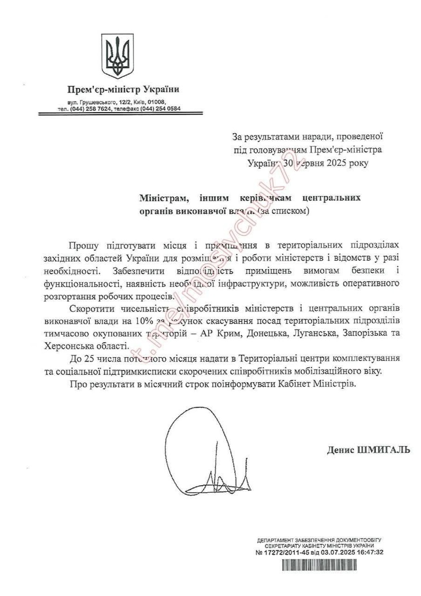 Он предписывает подготовить помещения в территориальных подразделениях западных областей Украины для размещения и работы министерств и ведомств в случае необходимости.