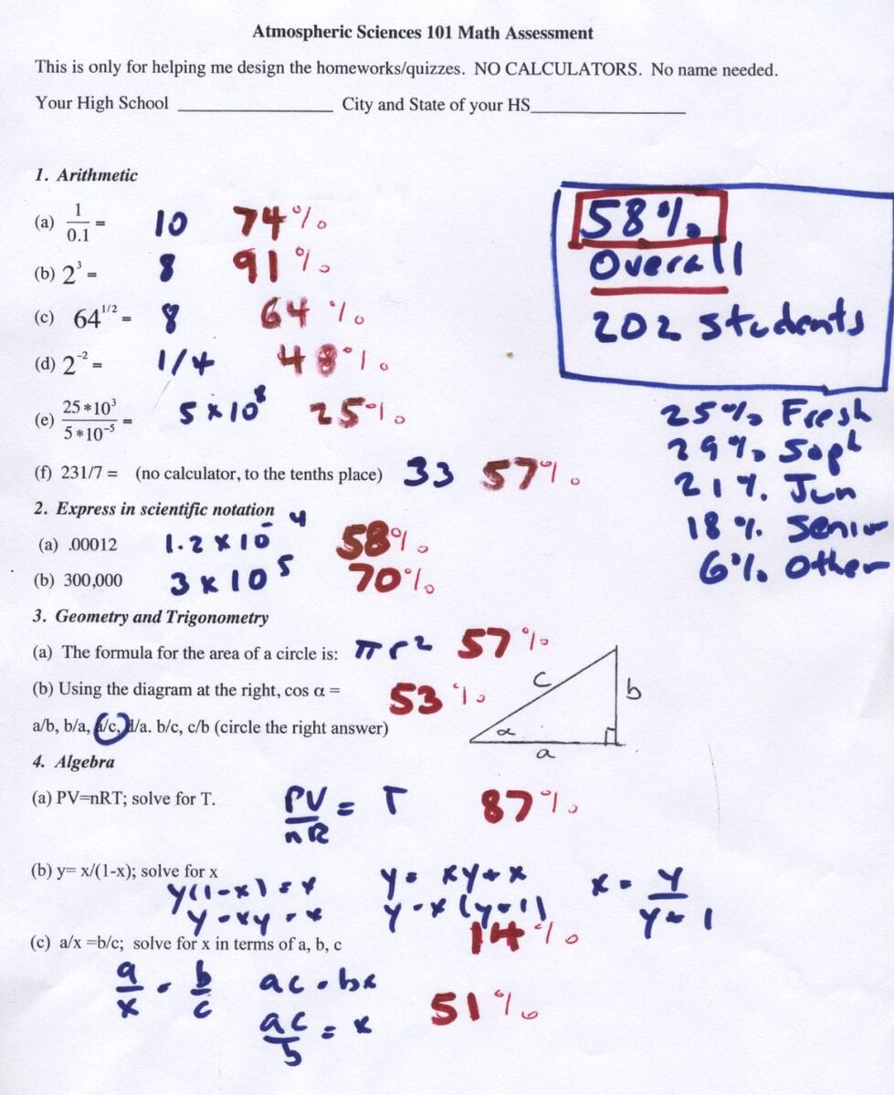 Клифф Масс, профессор университета штата Вашингтон, однажды выложил в сеть результаты проверки знания школьной математики студентами-климатологами (202 человека). Оказалось, что 43% из них не помнят площади круга, 47% — что такое косинус. Разделить 231 на 7 без калькулятора не смогли также 43%. Зато двойку в куб сумели возвести более 9 студентов из 10. Так что, в принципе, ещё не все потеряно