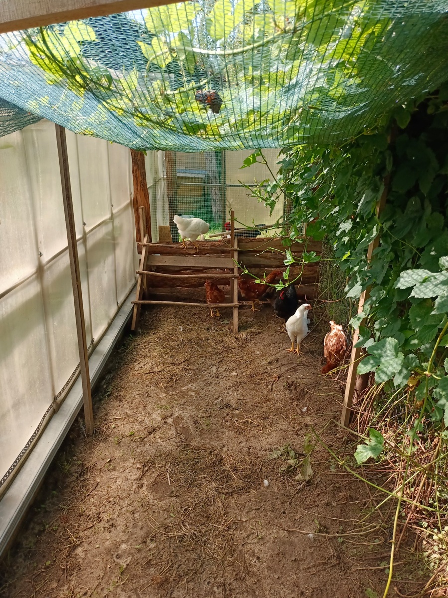 Сегодня переселение молодняка. Тех, кто вылупился в начале апреля и мая. Перетасовка : все куры отдельно, петухи отдельно. К курам только Пин пошёл, как командир. Всё же он черный петух, судя по гребням.