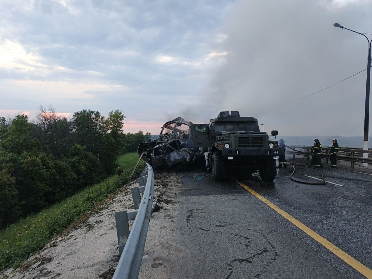 Семь автомобилей сгорели на трассе «Дон» в Елецком районе. По данным МЧС, пожар начался после столкновения грузовика, перевозившего товары «ОЗОНа» с техникой Минобороны: автомобилем «Ахмат» и пятью автомобилями «УАЗ». https://vk.com/video-212445666_456241735