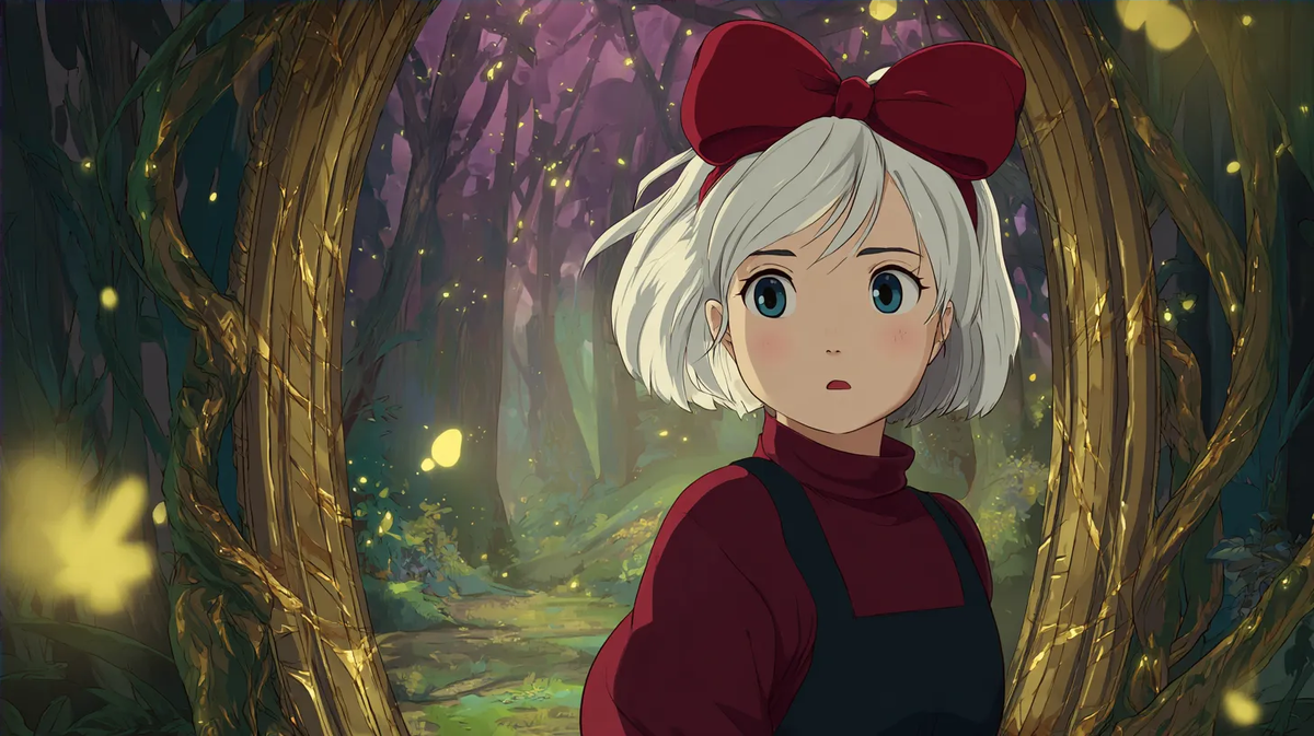 Лада шла по тропинке, обвитой солнечными бликами. Кусты расступались перед ней, будто знали дорогу. Птицы умолкли. Воздух сгустился, стал гуще, как мёд. Шаг — и ещё шаг — и… Поляна. Круглая, идеально ровная, выстланная мягким мхом, как зелёным ковром. А в центре — зеркало. Оно стояло без опоры, как вкопанное в землю окно. Высокое, выше взрослого человека. В раме, украшенной завитками, похожими на виноградные лозы. Поверхность тронута сетью золотистых трещин, как будто внутри него застыли молнии. Лада подошла ближе. И замерла. Отражение не повторяло её мир. Внутри зеркала — лес, но другой. Деревья были выше, их кроны — фиолетовые, а небо — лиловое, как в вечерней грозе. Вместо солнечных бликов — мерцающие точки, похожие на светлячков. И посреди этого — девочка. С таким же лицом. Такой же косой. В точно таком же платье. Но глаза… В её глазах был свет ночного огня и что-то ещё. Знание? Печаль? Или — игра? Девочка в зеркале сделала шаг — и оказалась совсем рядом. И улыбнула