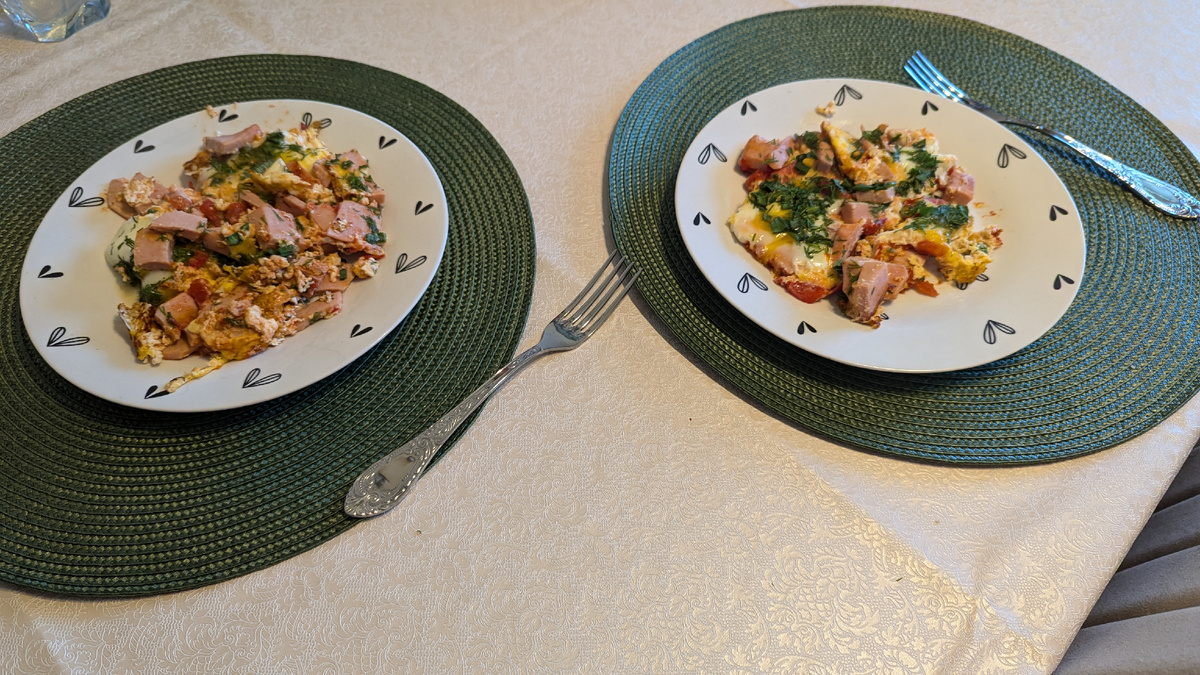 08:15. Просыпаюсь неспеша, будто выплываю из глубины тёплого сонного моря. Где-то там ещё колышется забытый сюжет, то ли поле, то ли море, то ли детство. Но тут Симба, мой верный страж, вдруг заливается звонким лаем, видимо, кто-то из соседей решил начать утро раньше нас. Приняла душ, и вода смыла остатки сна, как волна смывает песок с берега. Теперь я свежая, бодрая и готовая свернуть горы. Ну, или хотя бы сегодняшний список дел. Позвала Симбу на прогулку, но он, видимо, решил, что сегодня день неповиновения. Спрятался за диван, только чёрный нос торчит, как уголёк. Что с ним такое, не пойму, погода хорошая. Ну ладно, пусть дальше модничает, пойду завтрак готовить. 09:00. Завтракаем с мужем. Сегодня яичница с докторской колбасой и помидорами. Для аромата сверху присыпала зеленью. Ничего, симпатично получилось и даже вкусно. Муж по традиции сделал себе бутерброд с маслом к чаю. А я решила от бутербродов отказаться. Поэтому только чашечка кофе со сливками, ну и с маленьким творож
