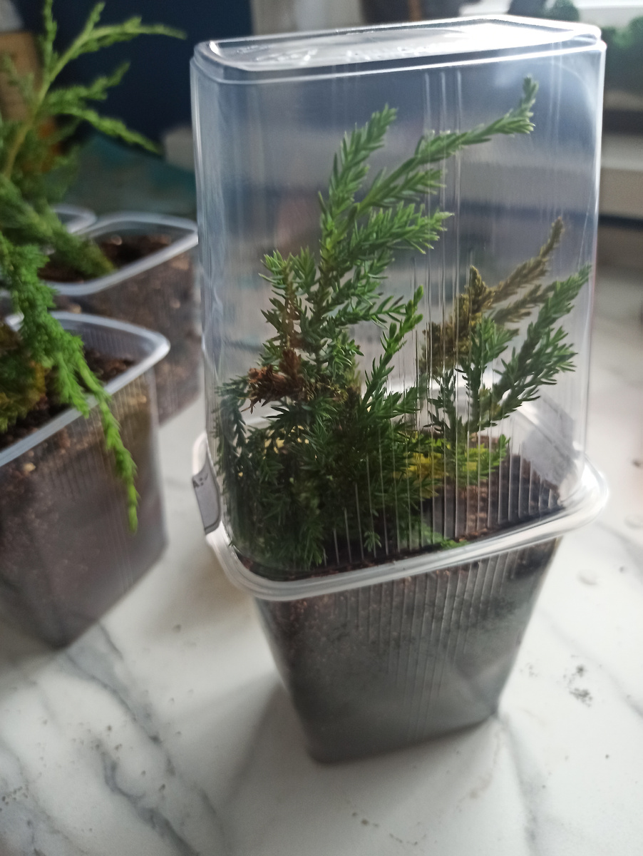 1.Возьмите одеревеневшие веточки 10-15 см 2. Обрежьте нижнюю хвою 3. Подсушите 2 часа 4. Смочите водой конец веточки, опустите в стимулятор корнеобразования 5 воткните в подготовленный влажный торф с песком. У меня просто плодородка с вермикулитом. 6 создаем тепличные условия 7 ждем 2 месяца. Должны появиться корни.