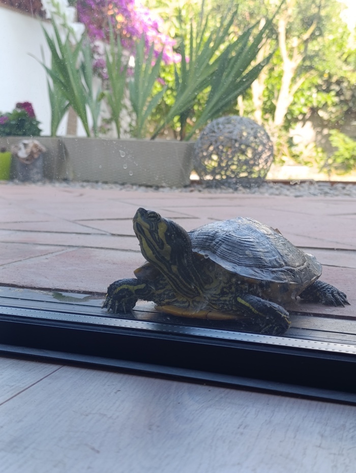 Всем привет! Хотела поделиться прогрессом черепашки. За месяц мы с ней познакомились получше, более-менее наладили совместный быт. Животным она оказалась очень активным и даже слегка социальным. До этого я видела её у прошлого владельца, она была довольно вяленькая из-за недостатка белка, тепла и солнечного света. Я ей купила подходящую еду со всякими там рыбками-креветками-кальцием, она аж обалдела, когда такое вкусное попробовала. Листья салата, которыми её раньше кормили, она презрительно отбрасывает лапой и с прищуром начинает меня рассматривать, типа, еду давай нормальную сюда. Я её потихоньку начала выпускать на террасу, она всё ломилась исследовать сад. Каждый день бегала в новый угол, составляла себе карту как робот-пылесос. В воду возвращаться сперва категорически отказывалась. Я пока не могу устроить ей положенный аквариум в 120 литров, но поменяла её тесное жилище на 60-литровый контейнер, и в саду тоже поставила водичку. Когда она поняла, что её запирать снова не будут как