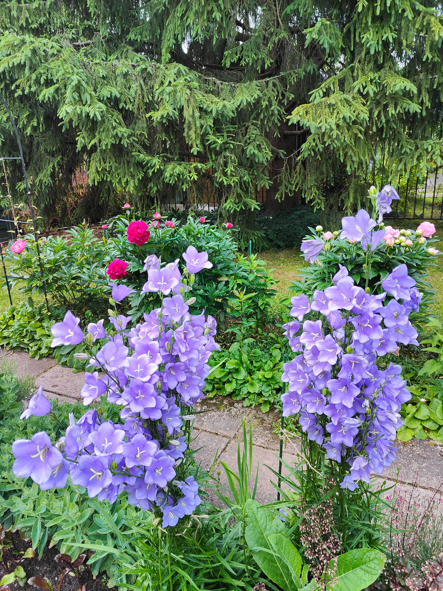Сад разогнался, каждый день зацветает что-нибудь новенькое. Только успевай фотографировать. Три дня без дождей - и мы вздохнули наконец-то! Мы - это и садоводы, и растения. Продолжает буйствовать голубой колокольчик персиколистный. Такого мощного цветения у меня ещё ни разу не было. Его белый собратец выглядит гораздо скромнее . Зацвела моя любимая роза Юбилей Санкт-Петербурга. Да, вот так поздно, потому что почти все побеги оказались слепыми, нормальных осталось только два. В миксбордере около дома распустила свои чалмовидные цветки саранка. Никак она не хочет делиться, растёт уже лет двадцать в гордом одиночестве. Эгоисткой оказалась. Колокольчик Пожарского в этом году развалился не так живописно, как обычно. Но сколько бы я ни пыталась разложить его побеги более привлекательно, они всё равно возвращаются на своё место. Рядом светится яркими огоньками гвоздика перистая. Наконец-то получилось размножить её черенками. Именно этот сорт оказался капризным. Дважды я брала на развод