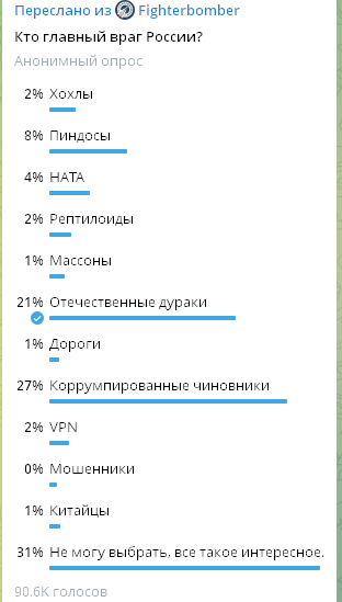 Вариантов два 1. Кто-то на этом хорошо зарабатывает. Досмотр это деньги. Большие! 2. Идиотизм Какой вариант кому ближе решит каждый сам. Каждый, кто ездил по мосту. Раньше я думал, что пробки на ровном месте без всяких на то причин это уникальная особенность московских властей и бесполезных ведомств типа ЦОДД и АМПП. Но нет. Есть те, кто готов потягаться с ними за лидерство в области бесполезных и вредоносных действий. О бестолковых, фейковых и мнимых проверках я писал много раз. Люди писали и пишут об этом постоянно. Но на людей то у нас плевать. Это понятно. Попался мне один опрос. Посмотрите. 90 тысяч проголосовали. Вопрос: кто главный враг России?