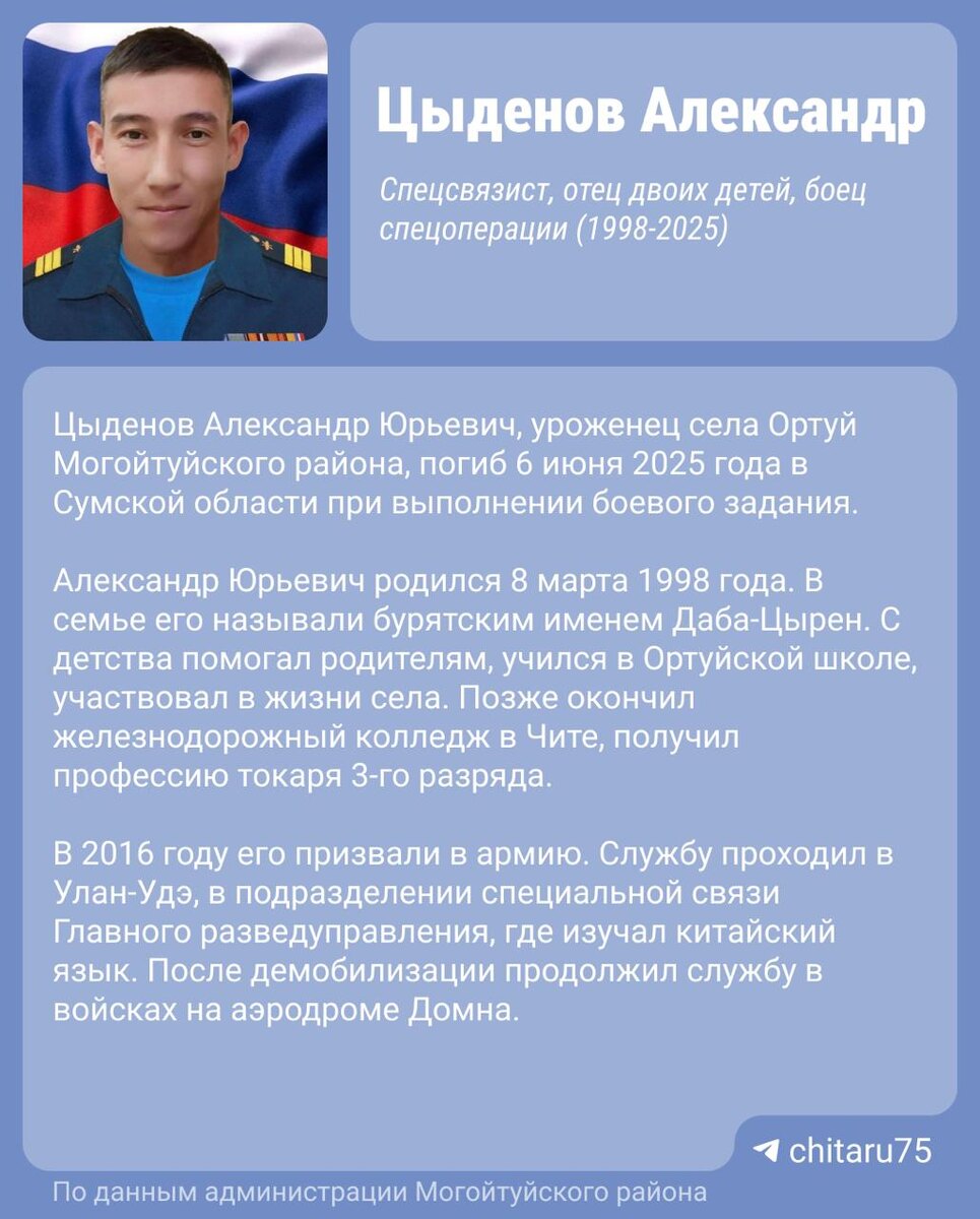 На СВО погиб спецсвязист из Могойтуйского района. Александр в 2023 году был направлен в зону спецоперации. Награждён медалями «За отвагу», «Участнику СВО», «За участие в военном параде в День Победы» и «Участнику манёвров “Восток — 2018”». После гибели посмертно удостоен ордена Мужества. Ему было 27 лет. У Александра остались супруга, две дочери, мама, сёстры и брат. 🟦 Подписаться | Предложить новость