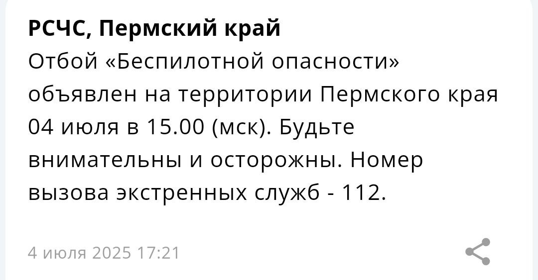 В Пермском крае 4 июля в 17:00 по местному времени отменили режим «Беспилотная опасность». Об этом сообщили через приложение МЧС и подтвердили в Министерстве территориальной безопасности Прикамья. Режим был введён в пятницу в полдень в связи с возможной угрозой атаки БПЛА. В результате в аэропорту Перми вводились ограничения на рейсы, а в городе фиксировались перебои с мобильным интернетом. Жителей призывали сохранять спокойствие и соблюдать меры предосторожности.