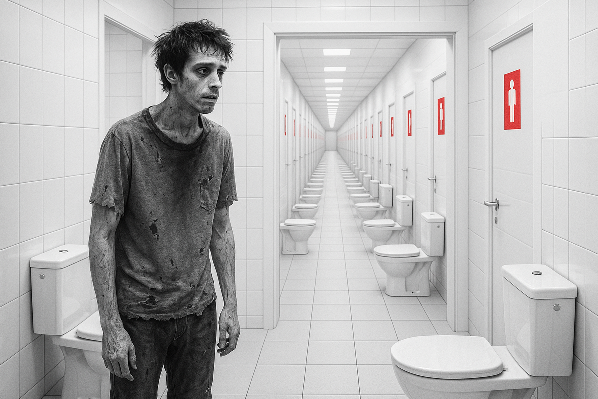 Я сидел на полу, тупо глядя перед собой. Справа я подпер дверь мусоркой — за ней виднелся тот же туалет. То же сделал с дверью слева. То же самое. Идентичные помещения тянулись в обе стороны. Ни мельчайшего отличия. Я подумал раскрыть ещё несколько дверей подряд, но сил уже не было. Да и появилась новая проблема: голод. Глубокий, грызущий, сводящий с ума.
