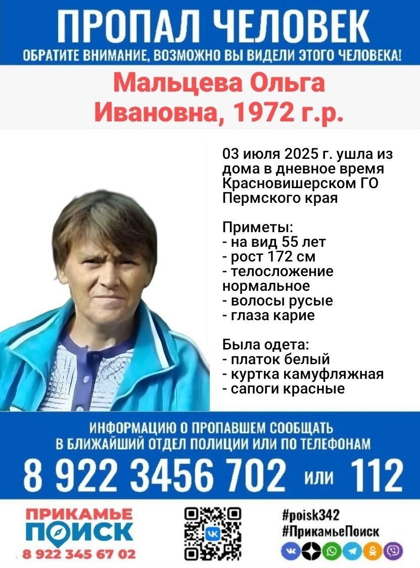 ❗❗СРОЧНО ТРЕБУЕТСЯ ПОМОЩЬ КВАДРОЦИКЛОВ❗❗ ❗ПРОПАЛА❗ МАЛЬЦЕВА ОЛЬГА ИВАНОВНА, 1972 г.р. Место сбора:посёлок Вая, Красновишерский район, Пермский край Координаты: 60.597840,58.379856 03.07.2025 ушла из дома в дневное время в Красновишерском г.о. Пермского края Если вам что-либо известно о пропавшем человеке, просьба сообщить по телефонам: 8 922 34567 02 или 112 #ПрикамьеПоиск #poisk342 #красновишерск