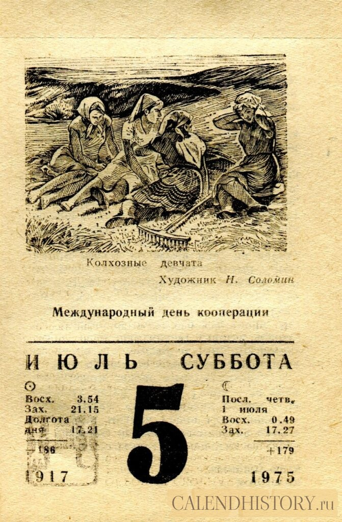 Итак, сегодня 5-го июля и у нас на календаре 1975-й год. Перед нами листок советского календаря для женщин. На календаре у нас суббота - 5 июля 1975-го года. Колхозные девчата Художник Н. Соломин Международный день кооперации *** Оборотную сторону листка этого календаря можно посмотреть у нас по ссылке на сайте. Другие листки советских календарей смотрите у нас на сайте - CALENDHISTORY.ru ПОСМОТРИТЕ ЕЩЁ ЛИСТКИ ОТРЫВНЫХ КАЛЕНДАРЕЙ: