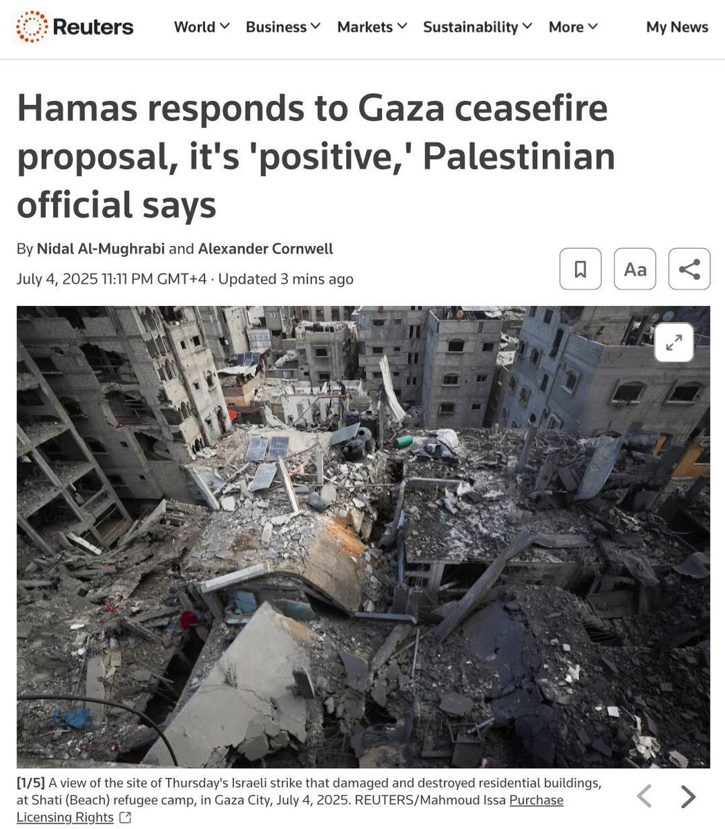 ХАМАС дало посредникам «позитивный ответ» на предложение США о прекращении огня в секторе Газа, — Reuters со ссылкой на палестинского чиновника.