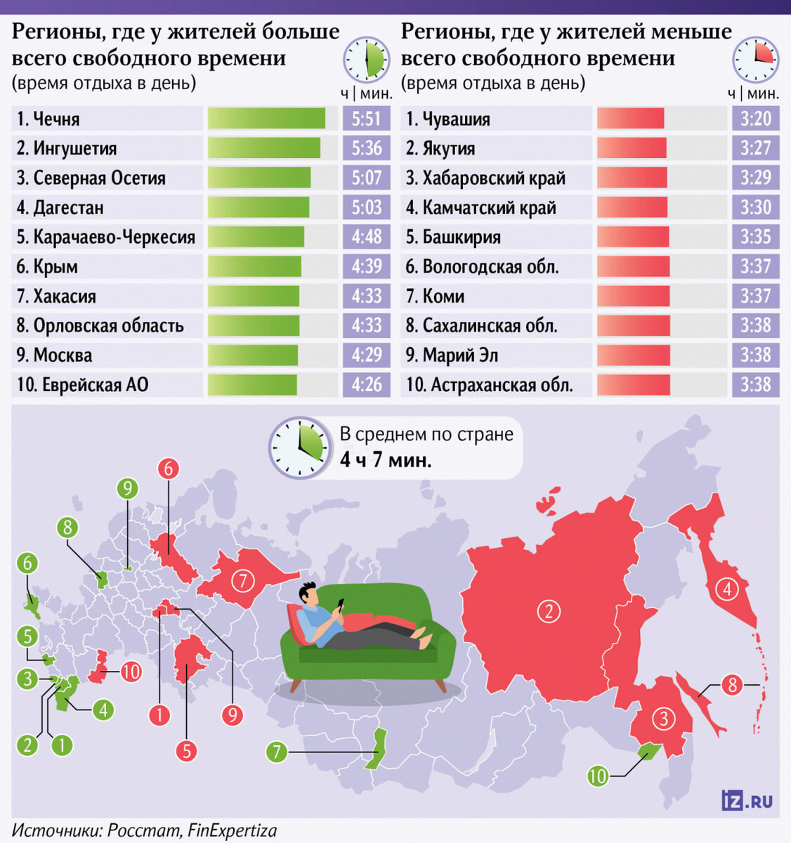 Чеченцы проводят в постели в среднем 10 часов 5 минут. Кроме того, они уделяют самое продолжительное время отдыху и тогда, когда бодрствуют, — по 5 часов 51 минуту в сутки. Это почти на 2 часа больше, чем в среднем по России. Меньше всего отдыхают среди россиян жители Чувашии — всего 3 часа 20 минут. Близки к ним по показателям оказались якуты, башкиры и жители Хабаровского и Камчатского краев. Москвичи находят больше времени на досуг благодаря гибким графикам, удаленной работе или занятости в сферах, позволяющих эффективнее распределять время.