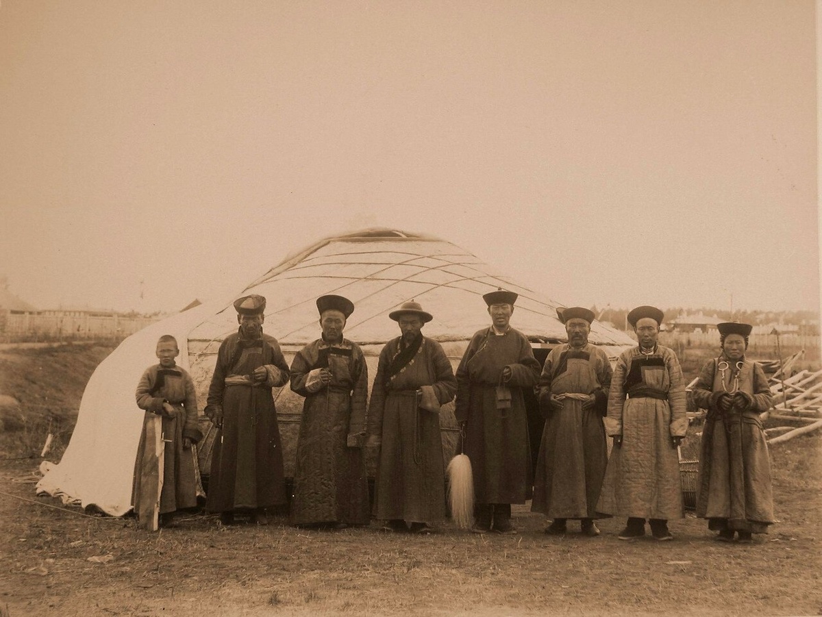 📷 Группа бурят у модели традиционной бурятской юрты, представленной на Читинской сельскохозяйственной и промышленной выставке, август 1899 года. Фото А. К. Кузнецова. Сводка ЧП
