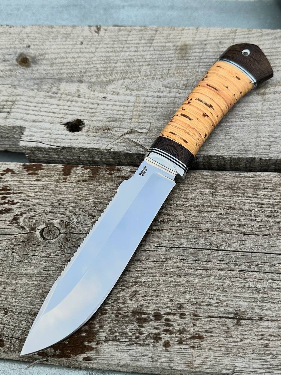 В свободной продаже большой рабочий нож из отечественной нержавеющей стали 95х18 с серрейтером. Рукоять на ноже выполнена из бересты, не скользит в руке и не боится влаги. Нож заточен в бритву. Твердость клинка (HRC): 58 Цена за нож: 8.840 рублей, со скидкой: 7.514 рубля. В комплекте идут ножны из натуральной кожи. Можем сделать формованные ножны +8000 рублей. Для заказа писать на @Nazarklinokbot или по тел +79101343831 WhatsApp/Viber