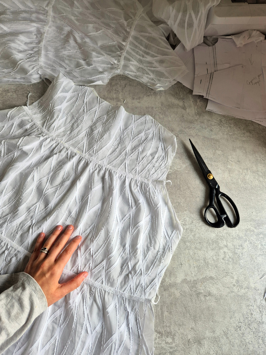 У меня ткань хлопковый филькупе, чуть ранее в статье рассказала про особенности этой ткани, она полупрозрачная и я решила всё обработать красивым оверлоком, срезая припуск до 0.5 см под оверлоком.