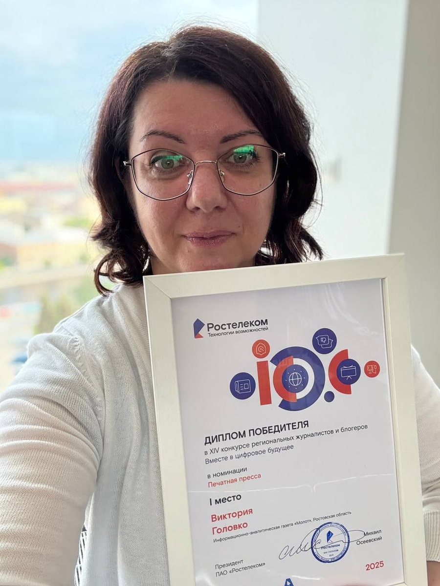 🔝Журналист газеты «Молот» победила во всероссийском конкурсе «Вместе в цифровое будущее» от «Ростелекома» В ходе этого состязания, ставшего уже XIV по счету, оцениваются работы журналистов, а также блогеров, посвященные нюансам технологического развития и цифровизации, новаторским решениям в сфере IT, вопросам роботизации и автоматизации, использования нейросетей и искусственного интеллекта. С каждым годом конкурс все масштабнее: в 2025-м жюри получило свыше 1700 заявок от журналистов и блогеров из разных уголков РФ. Партнер — министерство цифрового развития, связи и массовых коммуникаций РФ. Церемония награждения федерального этапа состоялась в Санкт-Петербурге. Виктория Головко, заведующий отделом «Политика» «Молота», заняла 🥇 место в номинации «Печатная пресса» с текстом «QR-код подсидел продавца». Прежде его признали лучшим на окружном этапе по ЮФО и СКФО. Прочитать текст можно тут. - Я сейчас представляю старейшее деловое издание Северо-Запада страны, которое при том, что, е