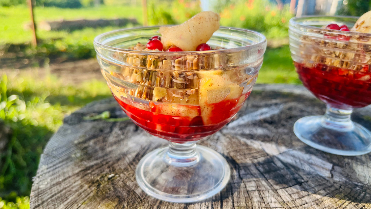 Сочные фрукты с хрустящими хлопьями — вот лёгкий десерт для каждого времени года. Здравствуйте! Сегодня приготовим десерт с красной смородиной. Сама смородина очень кислая, по крайней мере для меня, но в десерте она балансирует вкусы. Приготовление: 40 минут 250 г красной смородины; 6 ст. ложек сахарного песка; 3 яблока; 6 ст. ложек сливочного масла; 1/2 ч. ложки корицы 8 ст. ложек овсяных хлопьев среднего размера. 1.Хорошо вымойте и обсушите красную смородину. Положите две столовые ложки сахарного песка и оставьте на 20 минут. 2.Очистите яблоки и вырежьте семенные гнёзда. Нарежьте яблоки ломтиками. Разогрейте на сковороде 2 ст. ложки сливочного масла положите на сковороду яблоки, посыпьте их двумя столовыми ложками сахара и корицей. Помешивая, доведите сахар до образования карамели. Снимите яблоки со сковороды и остудите их. 3.Доведите до кипения сахар и смородину. Снимите с огня кастрюльку с красной смородиной и остудите ягоды. 4.Оставшиеся 4 ст. ложки сливочного масла разогре