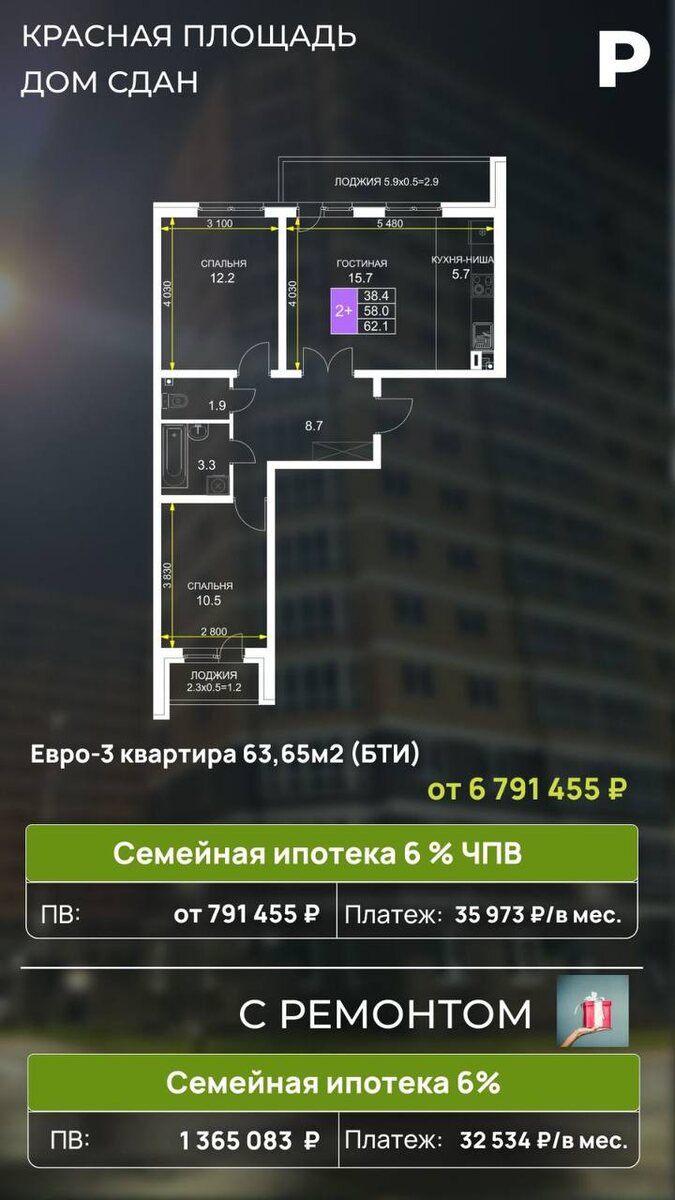 Большая 2-х комнатная квартира , или евро3 (как пишет сам застройщик) 63,65м2 с ремонтом уже в сданном доме