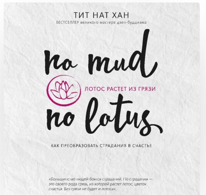 Рекомендация на сегодня. «Лотос растёт из грязи. Как преобразовать страдания в счастье» — книга Тит Нат Хана, дзен-монаха из Вьетнама. Основная идея книги — научиться правильно страдать, то есть не бежать от своих страданий, а распознавать и трансформировать их. «Тот, кто умеет страдать правильно, страдает намного меньше». Книга хоть и больше в психологический уклон, но лёгкая для прочтения. Автор рассказывает об искусстве быть счастливыми и даёт подробные практики, которые помогают достичь этого. Среди них — методы работы с эмоциями, которые может применить любой человек.