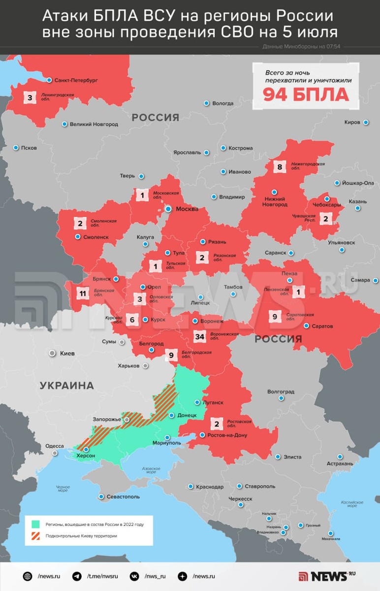 Около сотни беспилотников ВСУ атаковали 15 российских регионов минувшей ночью. ПВО РФ уничтожила 94 украинских дрона, сообщили в Минобороны. Больше всего (34 БПЛА) сбили над территорией Воронежской области. Подробнее — в нашей инфографике. ⭕ Подписаться | Прислать новость | Буст