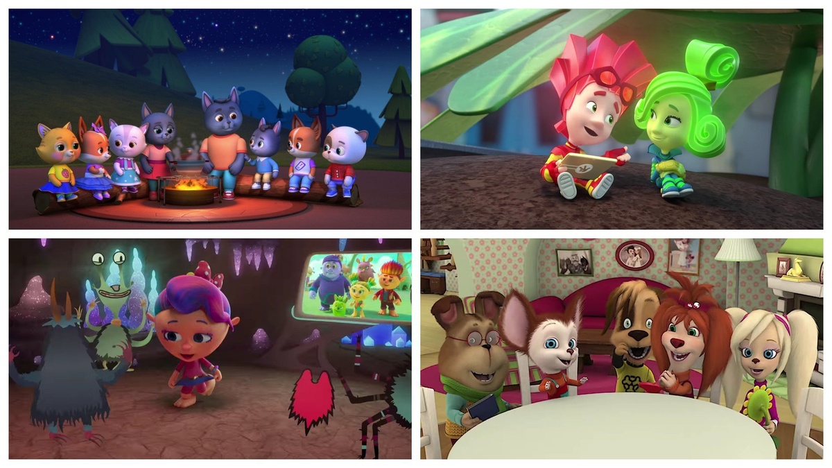 Начнем утро в компании дружных кошечек и собачек, нагуляем аппетит к обеду с монсиками, затем узнаем много нового от фиксиков, а вечером отдохнем с Барбоскиными.