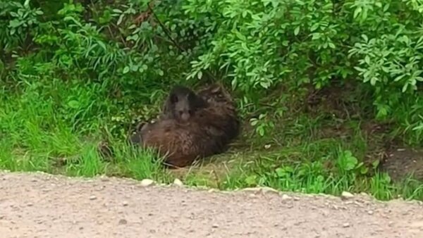 На обочине дороги был замечен медвежонок, скорбящий по своей матери.