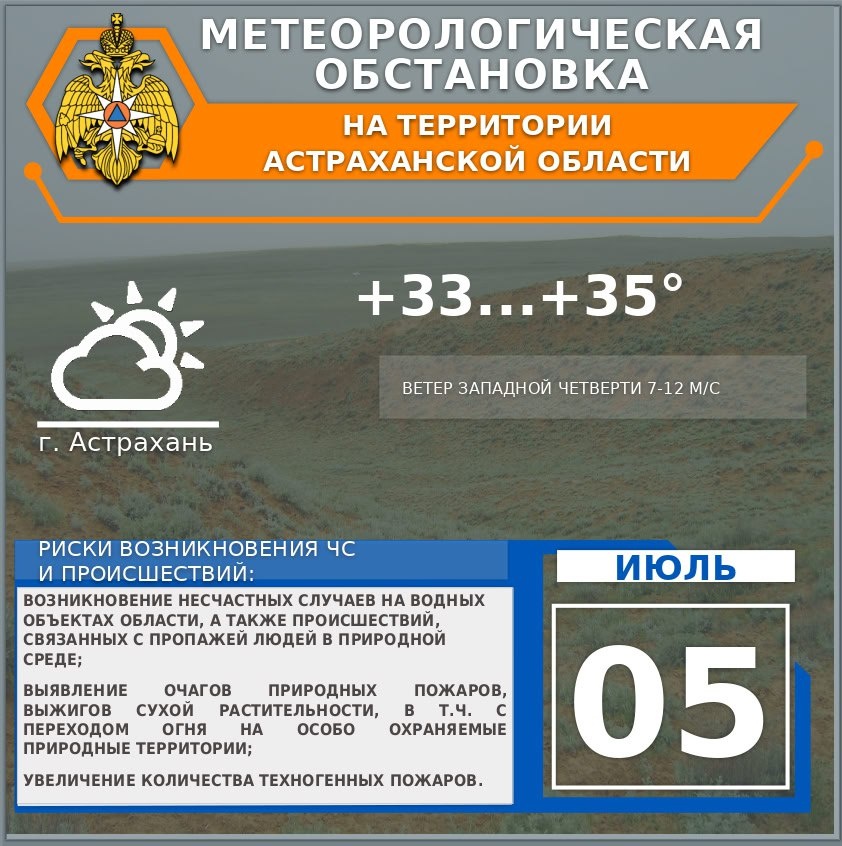 🌎Метеорологическая обстановка на 5 июля. На территории области переменная облачность🌤. Без существенных осадков. Ветер западной четверти 💨7-12 м/с. Температура воздуха днем +31...+36°, ночью +18...+23°🌡, По г. Астрахань переменная облачность⛅️. Без существенных осадков. Ветер западной четверти💨 7-12 м/с. Температура воздуха днем +33...+35°, ночью +21...+23°🌡.