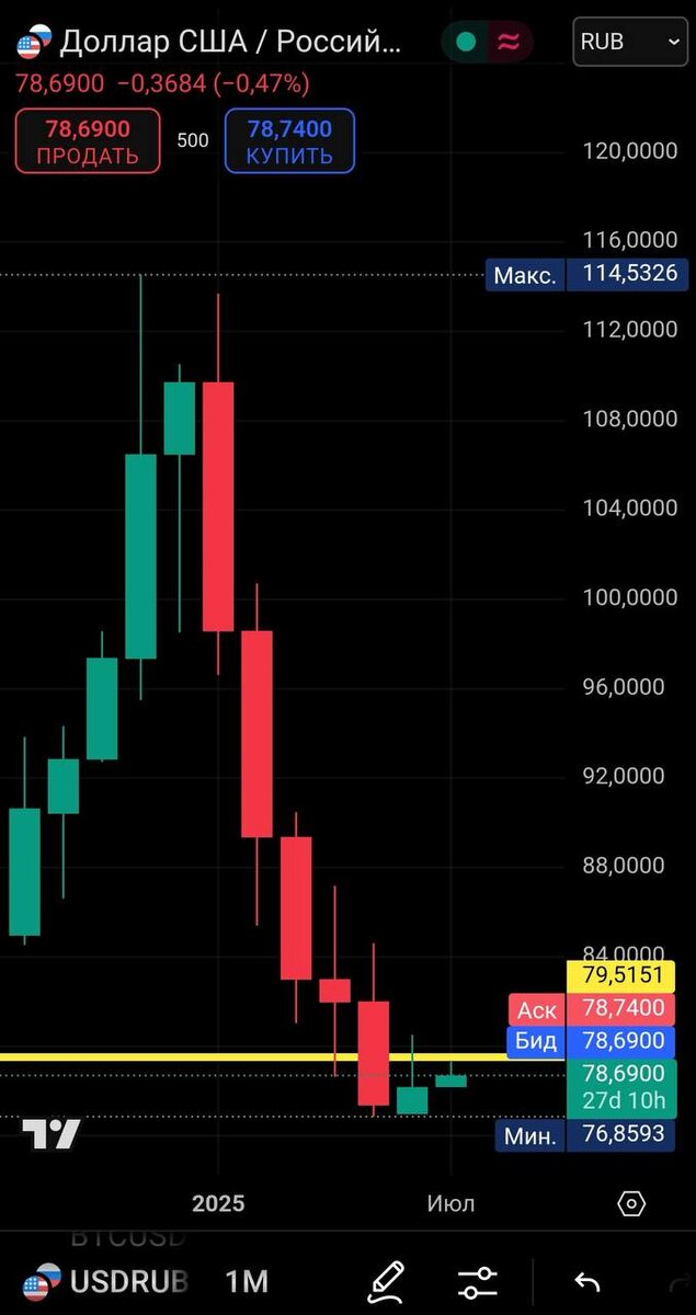 🇷🇺🇺🇸Рубль к 50 за доллар? Почему будущее российской валюты может удивить! Доллар Рубль следим за максимальным значением, июньской свечи 80,5₽ Пока даунтренд, в котором каждый последующий месяц ниже предыдущего. Что важно понимать: 1. Окончание СВО, приведет к укреплению рубля, -Снизятся транзакционные издержки, -уйдут ненужные посредники, -дисконт на нефть сократиться, -Выручка валютная увеличится В торговом балансе уже видим перекос в пользу рубля, Сейчас ключ выше инфляции на 10%, это приводит к сокращению импорта. 2. Экономике не выгоден крепкий рубль? А что делать? Есть один способ девальвироватб рубль, ЦБ начнет покупать валюту, Но это запуск печатного станка, И разгон инфляции, А ЦБ главной целью называет, 4% по инфляции, Пока этой цели мы не достигнем, рубль идет в сторону 50₽ за бакс. Выпадающие нефтедоходы, просто прибавили к дефициту бюджета, в 2025 он будет около 4 трлн, и покроют его за счёт новых налогов или из ФНБ возьмут, там более 13 трлн. И кстати не забывайте