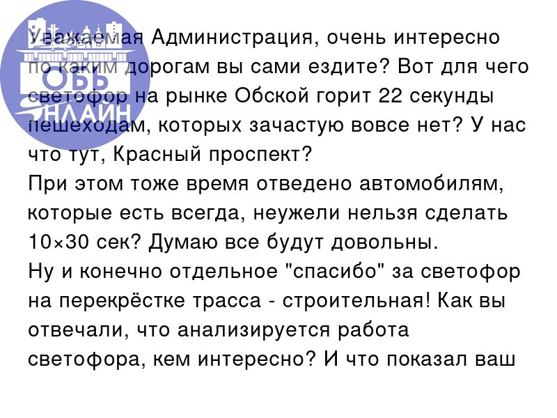 ↗ Уважаемая Администрация, очень интересно по каким дорогам вы сами ездите? Вот для чего светофор на рынке Обской горит 22 секунды пешеходам, которых зачастую вовсе нет? У нас что тут, Красный проспект? При этом тоже время отведено автомобилям, которые есть всегда, неужели нельзя сделать 10×30 сек? Думаю все будут довольны. Ну и конечно отдельное "спасибо" за светофор на перекрёстке трасса - строительная! Как вы отвечали, что анализируется работа светофора, кем интересно? И что показал ваш анализ? Пробка+пробка??? vk.com Подробнее на https://vk.com/ob.gorod #городобь #городобьонлайн #толмачево