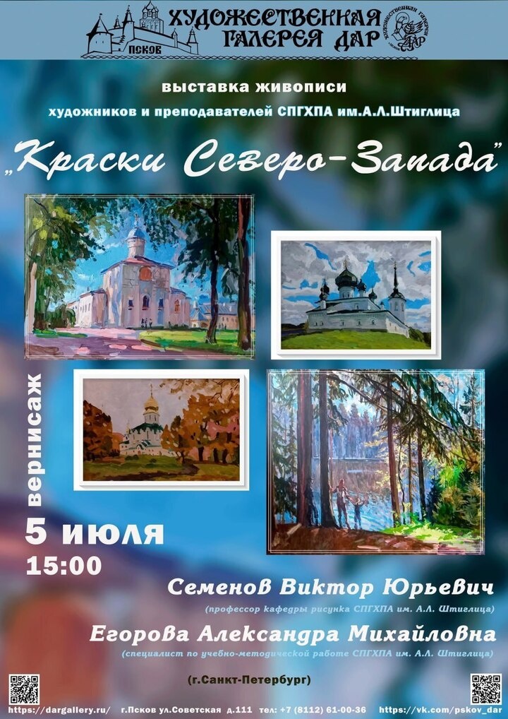 В субботу, 5 июля, в 15:00 в галерее “Дар” состоится открытие выставки живописи двух талантливых художников – Виктора Семенова и Александры Егоровой, преподавателей Санкт-Петербургской государственной художественно-промышленной академии имени А.Л. Штиглица. На выставке будут представлены натурные работы, созданные в Санкт-Петербурге, Старой Ладоге и Великом Новгороде. Приглашаются все желающие насладиться искусством и зарядиться эмоциями от творчества профессионалов. Вход свободный. Адрес галереи: г. Псков, ул. Советская, 111. Контактные телефоны: +7 (8112) 61-00-36, +7 (921) 211-00-36.
