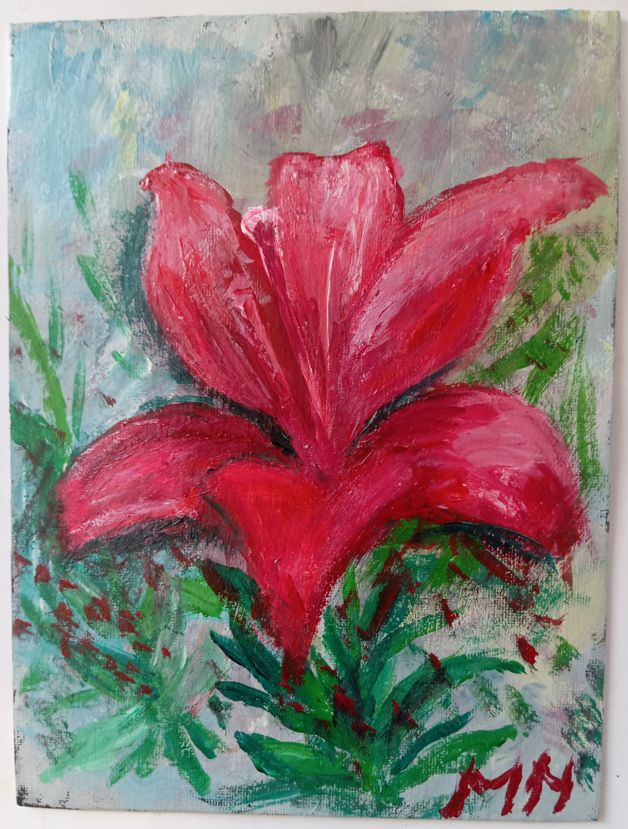 В прошлом году любовалась розовыми лилиями, растущими на клумбе у дома, в этом году выросла алая лилия. Много раз писала лилии, белые, которые росли на даче у Катеньки – моей второй дочери, жены сына, оранжевую лилию рисовала в подарок для родственницы на ее день рождение. «Японцы считают, что цветы лилии в доме приносят братство и благополучие. Причем, они отдают предпочтение ярким оттенкам этого цветка - оранжевому, красному или розовому. Считается, что у таких цветов очень сильная энергетика, притягивающая достаток и успех» - из Гугл. Лилию рисую на холсте на картоне размером 18х24, который загрунтовала черным грунтом, поверх которого написала фон, сверху кистью белой краской начну писать набросок. Мне понравилось рисовать набросок сразу кистью. Часто встречаю рассказы опытных художников про ошибки новичков, для меня странно, что не слышу в них, того, что и приводит к ошибкам, про тот навык, который следует развить в себе, если хочешь развлекать себя рисованием. Внимание, а точнее К
