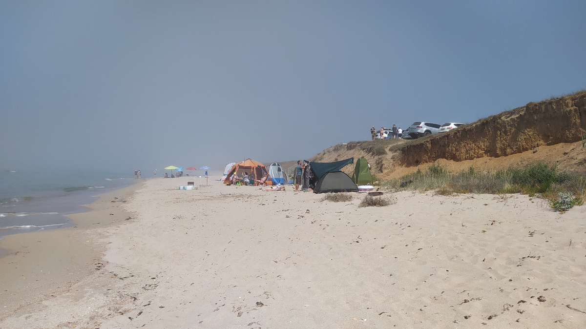 5 июня. Густой туман.Палатки, зонтики,холодное море,отдыхающие. Западный Крым.
