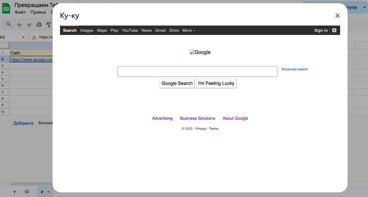 Браузер внутри Таблицы? Легко! Друзья, немного отвлечёмся от формул. В этом видео я покажу, как всего 19 строками кода в редакторе скриптов Google Таблиц превратить саму Таблицу в браузер. Что это значит? Вы сможете открывать нужную ссылку прямо в окне Таблицы. Зачем это нужно? Например, так можно проверить, какие сайты можно спарсить через скрипты (в этом случае вернётся нормальная страница), а какие — нет (появится капча или другие защитные механизмы, которые поймут, что заходят не как обычный пользователь). Таблица Весь код function f1() { const url = SpreadsheetApp.getActive() .getRange("#!A2") .getValue(); const response = UrlFetchApp.fetch(url); return response.getContentText(); }; function f2() { //выводим html-код в Таблицу окном const html = HtmlService.createHtmlOutput(f1()) .setWidth(900) .setHeight(700); SpreadsheetApp .getUi() .showModalDialog(html, 'Ку-ку'); };