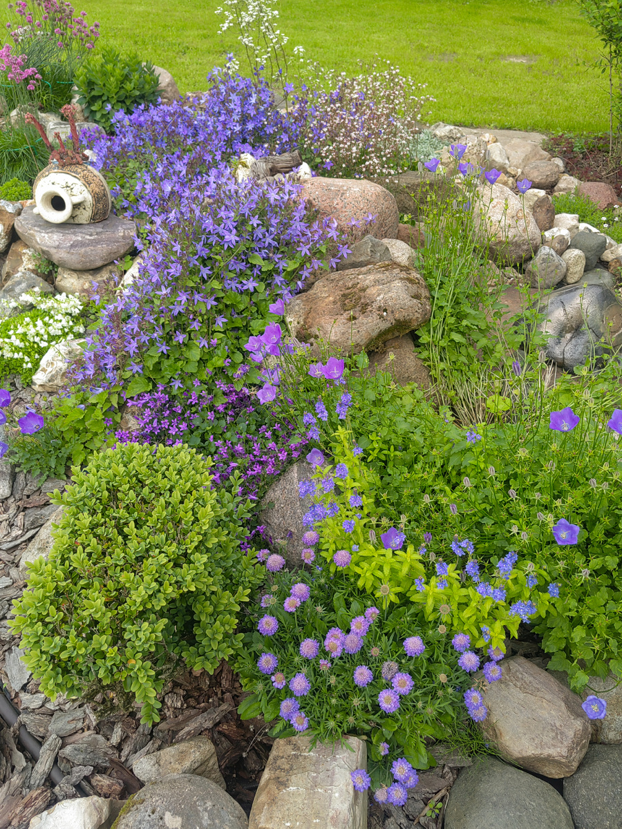 В моем Каменном царстве собрана уже вполне приличная компания разнообразных мини- колокольчиков. Небесная лазурь, океаническая бездонная синь и воздушная белоснежная морская пена завораживают и очаровывают с первого взгляда. 🔻🔻🔻 Гарганский,Карпатский,Ложечницелистный,Портеншлага,Пожарского-самые известные карликовые колокольчики. 🔻🔻🔻 Так получилось, что в моя колокольчиковая коллекция в основном синеглазая,и только крошечные кочечки ложечницелистного малыша сияют своей фарфоровой белизной. И вот в один из моих очередных недавних набегов на С.Ц. рядом с домом внимание привлек вот этот красавчик белого цвета, чуть отдающий в голубизну. Красавчиком можно в данный момент было назвать его с натяжкой, малыш -чуть потрёпанный и поджелтевший. Но зато по бокам горшка я узрела многочисленных деток, которых явно можно будет отсадить, подрастить и заселить в разные части сада для подстраховки.(Решила дублировать колокольчики еще под горной сосной.) А зелень-дело наживное. Девочки