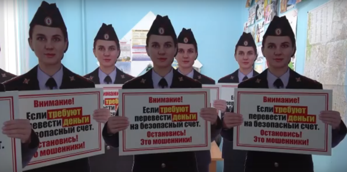 В руках полицейская красавица держит плакат, предупреждающий о распространённом приёме мошенников – требовании перевести деньги на безопасный счёт. По замыслу полицейских политехнологов, макет сотрудника полиции способен переключить внимание жертвы мошенников и таким образом поможет не поддаться обману.