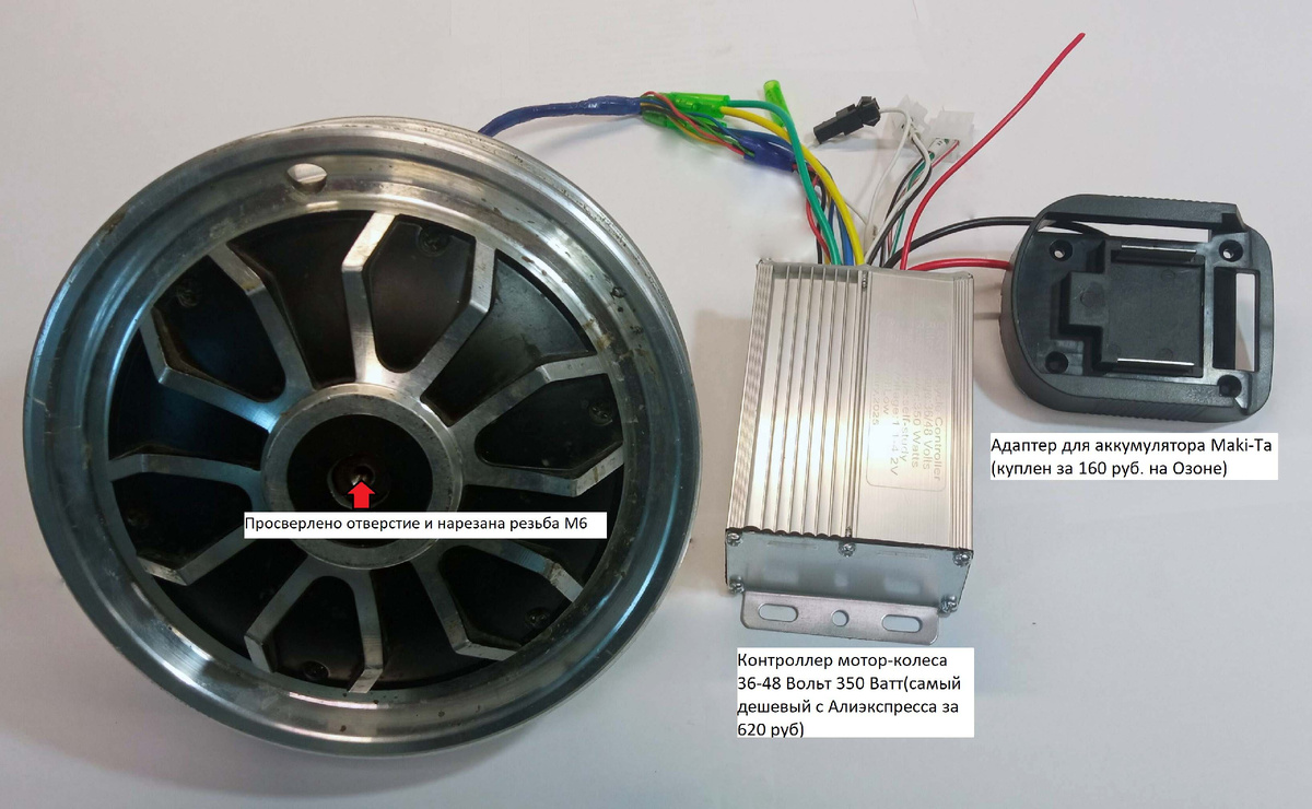 Бегать быстро за тачкой я не собирался и надеялся, что мне хватит мощности одной батареи на 18 вольт. Но сразу оговорюсь этого мало, пришлось ставить две батареи последовательно. Были приобретены: контролер