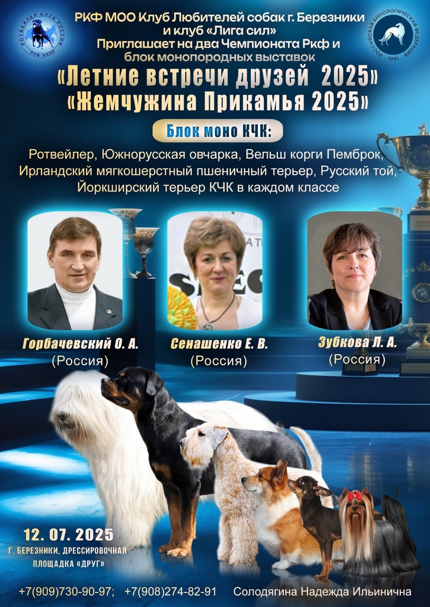 ⏰ 12 июл (7д) 🏛 #Березники #Пермь #Россия #Выставка 🐶 Выставка собак: Летние Встречи Друзей 2025 🏆 Кинологический клуб "Лига Сил" Контакты организаторов здесь: 🌐 https://www.petsman.ru/vystavki-sobak.php?mesto=4184-berezniki Чемпионат РКФ "Жемчужина Прикамья 2025" Чемпионат РКФ "Летние Встречи Друзей 2025" Монопородная выставка ротвейлеров ранг КЧК Монопородная выставка йоркширского терьера ранг выставки КЧК в каждом классе Монопородная выставка русского той ранг выставки КЧК Монопородная выставка южнорусской овчарки ранг выставки КЧК Монопородная выставка вельш корги пемброк ранг выставки КЧК Монопородная выставка ИМПТ ранг выставки КЧК 🧑 👨 Эксперты: 🔹 Екатерина Сенашенко 🔹 Людмила Зубкова 🔹 Олег Горбачевский