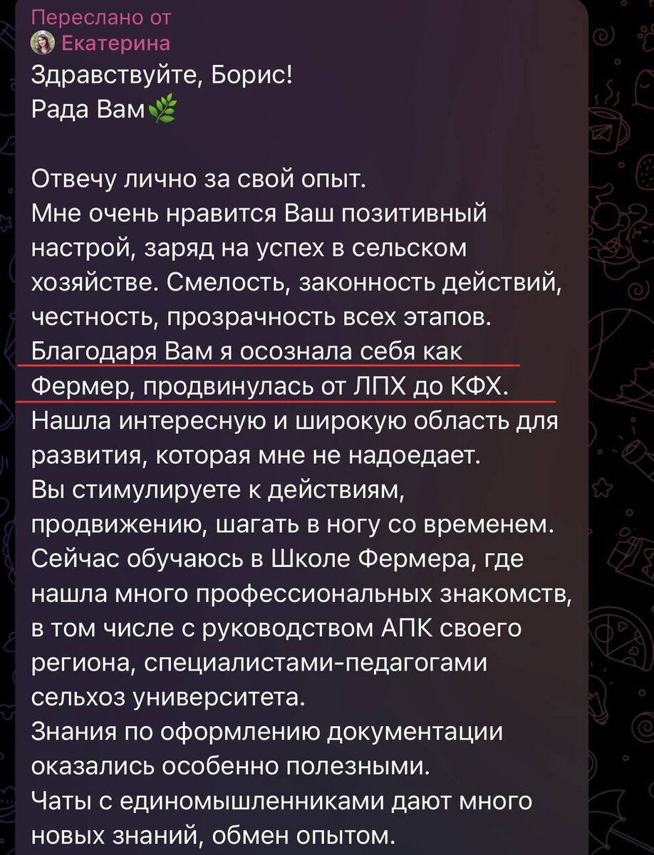 🧑🌾 Земля - это не просто имущество. Она становится для многих гараздо большим. Решил сейчас выложить серию отзывов своих учеников и начнём мы с Екатерины. Когда прочитал сообщение — и узнал в ней себя. «Благодаря вам я осознала себя как фермер. Продвинулась от ЛПХ до КФХ. Нашла интересную и широкую область для развития, которая мне не надоедает.» Для меня это самое важное — когда человек начинает действовать осознанно. Не просто что-то «оформлять», а понимать, зачем. Как устроена система, куда можно двигаться, с кем выстраивать контакт. 📚 Екатерина сейчас учится в «Школе фермера», знакомится с руководством АПК, с вузами, чиновниками. И это только начало. 📅 Ну а уже через 2 дня стартует следующий поток обучения. Если хочется понять, как работает земля — приходите. Сайт с подробным описанием обучения : https://pro-zemli.ru/kurs Специальные условия со скидкой здесь 👉 : https://info.pro-zemli.site/anketa