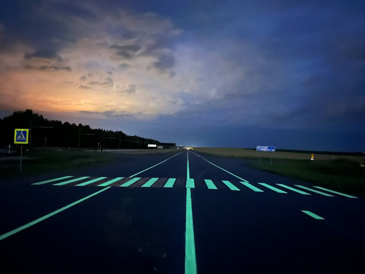 В Гомельской области на 162 км автодороги Р-31 «Бобруйск-Мозырь-граница Украины» начался уникальный проект: дорожную разметку покрыли светящейся в темноте краской. Днем разметка «заряжается» от солнца или фар, а ночью излучает мягкое зеленоватое свечение, делая дорогу видимой без дополнительного освещения. Эта трасса неслучайно выбрана для эксперимента: “Стоит отметить, что впервые на территории нашей страны на дороге республиканского значения начали тестировать люминесцентную разметку”, – сообщили в ГАИ. Новости по теме: На одной из автодорог Гомельщины установили инновационные LED-маячки