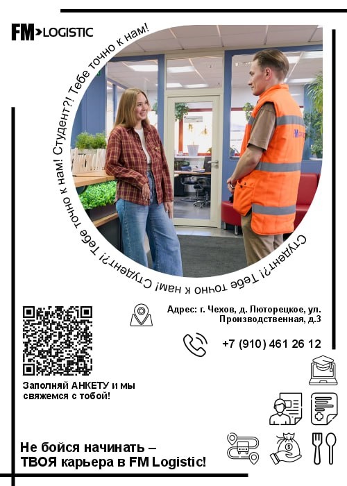 СТУДЕНТ?! ТЕБЕ К НАМ! 📣 СТИПЕНДИЯ от FM на 3 месяца - 5 000 руб/мес к зар.плате FM Logistic - международная транспортно-логистическая компания, динамично развивающаяся на российском рынке. Вакансия: 🔝 Работник склада - от 91 280 руб., до вычета НДФЛ Для Вас: - Удобный график для совмещения с учебой - Премия к Акции “Приведи друга” - 15 000 руб. - Возможность выиграть АЙФОН за приведенных друзей - Корпоративный транспорт - Льготное питание - Бесплатно: спец.одежда и обувь - Обучение и карьерный рост - Официальное трудоустройство СТРОГО с 18 лет - Скидки от партнеров Место работы: Московская область, г. Чехов, д. Люторецкое, ул. Производственная, 3. Заполняйте анкету, и менеджер свяжется с Вами: https://clck.ru/3CyYYS ☎️: 8-910-461-26-12 Работай_на_частоте_FM!