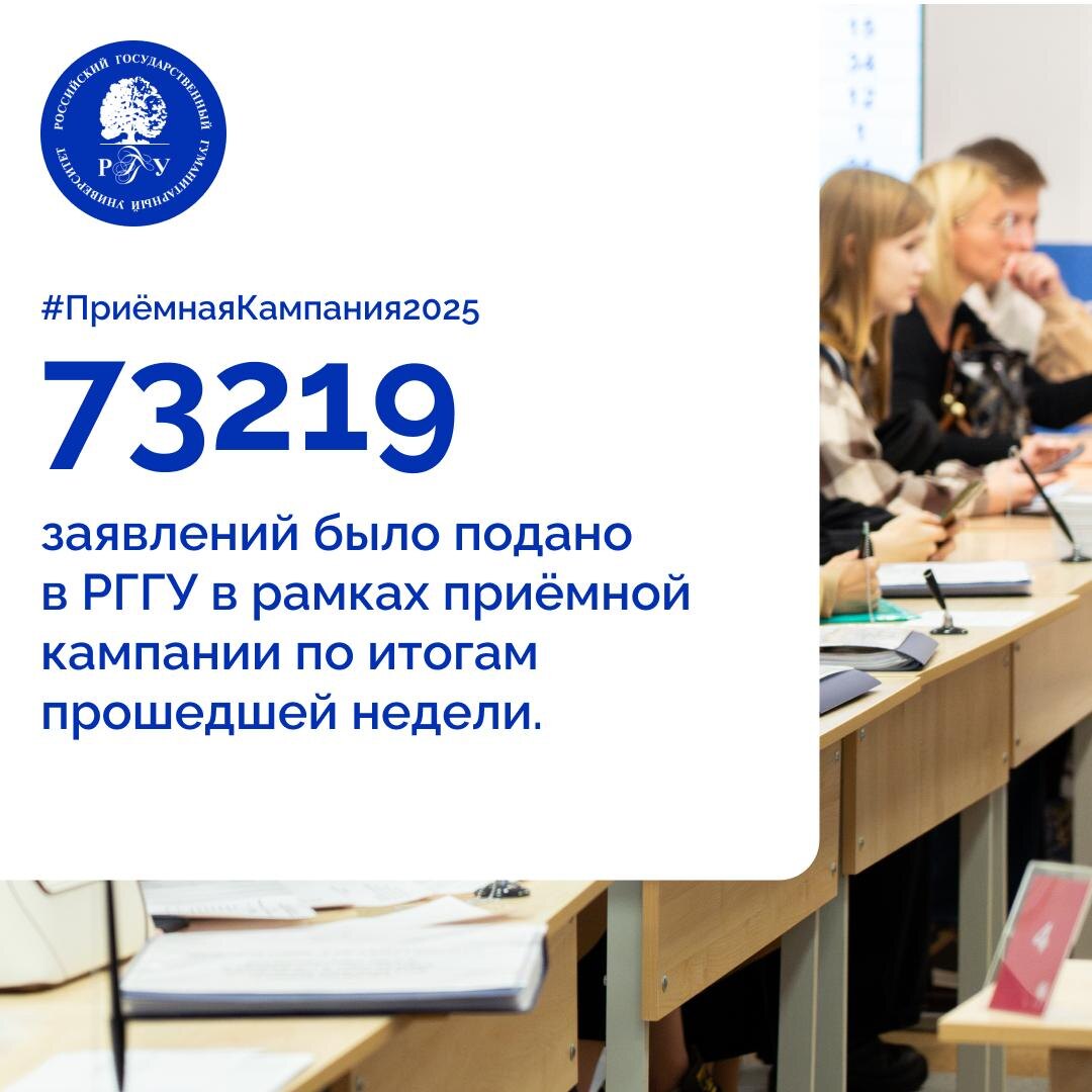 #ПриемнаяКампанияРГГУ 🔥 РГГУ подводит итоги очередной недели приёмной кампании 2025 года: на данный момент подано – 73 219 заявлений! Приёмная кампания продолжается, и у вас ещё есть время подать документы в РГГУ. Ждём вас в понедельник! ⚪ Подписаться на РГГУ #РГГУ #СтудентРГГУ