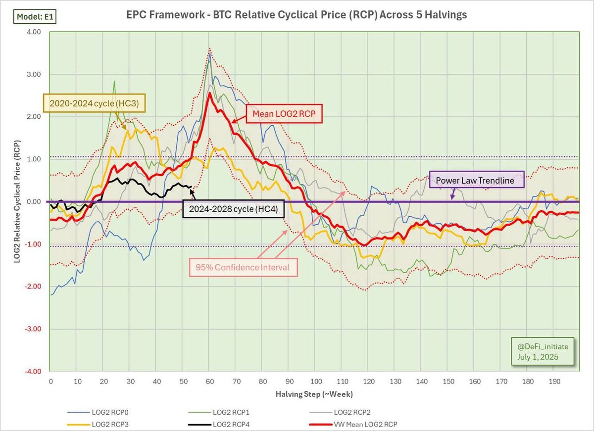 Сценарий на пике: $280,000 Свежий апдейт по одной из самых интересных моделей оценки циклов BTC — EPC (Elastic Power Cycle). Модель E1 прогнозирует пик текущего бычьего цикла в районе $280,000, с максимальной вероятностью в августе 2025 🤔 Что мы видим: • Сейчас цена отстаёт от модели на 21%, но всё ещё движется в её рамках • Все 6 моделей дают диапазон пика от $180K до $290K • Сроки — от середины июля до конца января 2026 • График LOG2 RCP (отклонение от циклической медианы) подтверждает, что текущий цикл ещё не завершён — мы даже не вышли за среднюю траекторию роста Это важное уточнение. На фоне медленного роста, падения волатильности и выносов по стопам легко забыть, что рынок всё ещё в фазе расширения. EPC-модель не опирается на эмоции или новостной шум. Она базируется на закономерностях силы отклонения цены от силового тренда, сохраняя привязку к статистике. Что это даёт инвестору — Указание, что рано фиксировать всё — Осознание, что впереди возможна фаза экспоненты — Спо