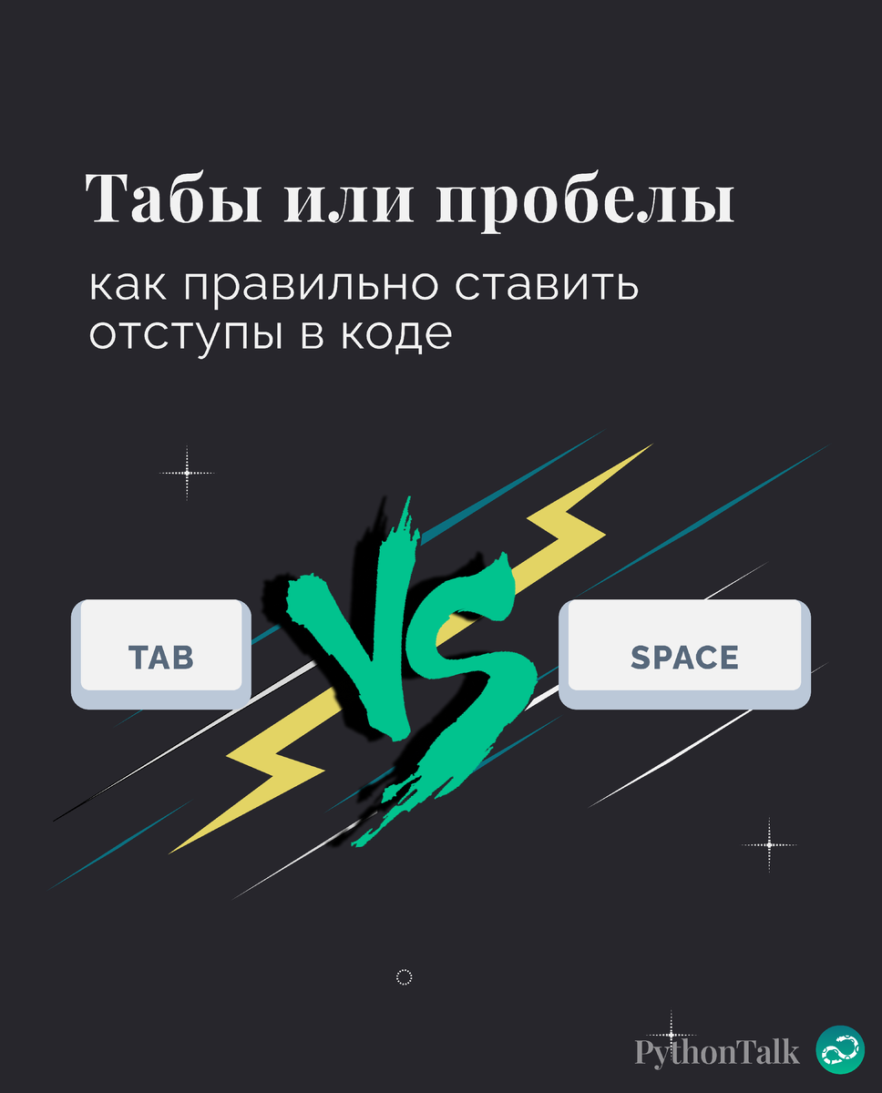 Казалось бы, какая разница, чем ставить отступы в коде? Главное, чтобы работало. Но это один из тех споров, который жил, жив и будет жить. Насколько всё может быть серьезно, гениально показано в культовой сцене из сериала «Кремниевая долина». Если вы ее еще не видели — обязательно посмотрите. Чтобы раз и навсегда (нет) покончить с этим, я подготовил серию наглядных карточек 👇🏻 Если в большинстве языков программирования отступы — это просто вопрос красоты, то в Python всё иначе. Здесь отступы — это часть синтаксиса. Именно по ним интерпретатор понимает, где начинается и заканчивается тело функции или цикла. Ошибся с отступом — получил IndentationError и пошёл дебажить. В сцене из сериала мы слышим почти все классические аргументы. Давайте их разложим по полочкам. Лагерь Ричарда (адепты табов): Лагерь его девушки (последователи пробелов): Как мы видим, конфликт привел к разрыву. А всего-то нужно было договориться. Для этого и существуют простые правила. Ключевая мысль здесь — консисте