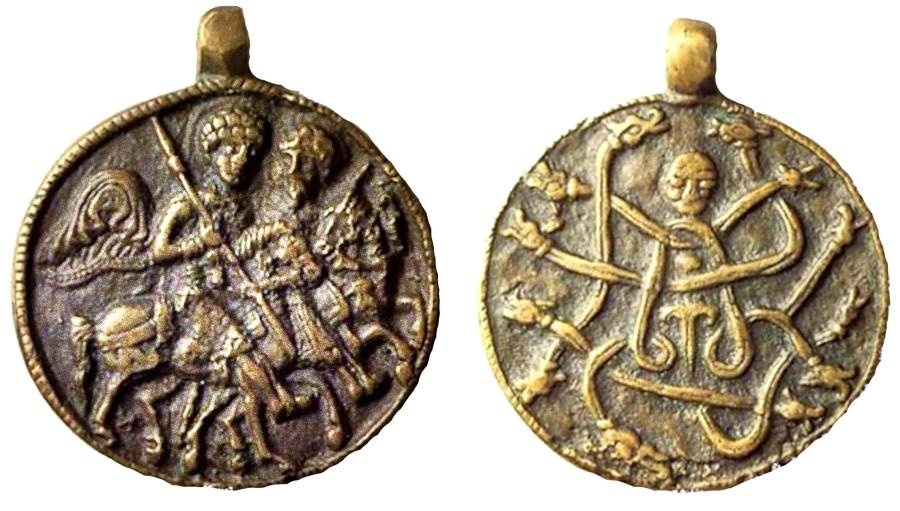 Русский змеевик, изображение Русалки как змееногой Девы. По Новой Хронологии, это богородица мать Христа. Христос – Скиф, сын Геракла от змееногой Девы. На обороте пара конников, возм., отец Христа – Георгий-Победоносец (HoRSey). Кстати, пара коней это 8 ног, т.е. восьминогий Слейпнир конь Одина. Георгий и Один связаны с драконом-змеем. КоННик родственно кон как закон, канон (сословие всадников – верхушка знати). Фигура русалки – стилизованная арабская надпись в три слова: 1. "печь, очаг", однокоренное с глаголом "скрывать" КНН (кяф-нун-нун); 2. "этот бог" (Аллах); 3. "основа, начало" РСС (ра-син-син). Араб.КНН, КН – закон, кодекс, норма, ограничить, гниль, плесень, прогорклый, право, статут, канон, цитра, легальный, юрист, курятник, манжета, раб, крепостной, верх, бутыль, флакон, пузырёк; искать подземную воду; икона, образ; болт; крыть, таить, прятать, питать, стихать, успокоить, гнездо, печь, очаг, логово, жильё, беседка, навес, колчан, невестка, золовка; домосед, устроить. КаНуН –