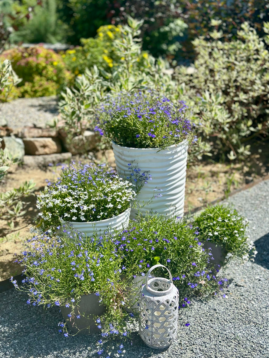 Помимо посадок декоративных растений в открытый грунт и в клумбы очень любим применять этот ландшафтный прием. Это небольшой уголок нашей новой, расширенной зоны отдыха, переделку которой мы осуществили в этом сезоне. Снять для вас более подробное видео о ней? В зоне отдыха мы расставили несколько кашпо. Они удобны тем, что в период, когда цветения нет, их можно убрать в неброское место, а во время пика цветения поставить поближе, на место более парадное. Получается некий мобильный цветник, который очень удобно менять в зависимости от степени его декоративности. В этом году особенно радует лобелия, не капризничает, цветет обильно и непрерывно. Из нее мы сформировали цветник из пяти кашпо. На наш взгляд, его секрет заключается в том, чтобы с одной стороны было сохранено некое дизайнерское единство, а с другой стороны, было разнообразие. Два белых цилиндрических белых вазона одного дизайна, но разного размера, дополняет приземистый небольшой контейнер того же цвета. А по бокам серые каш